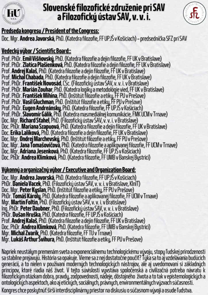 Napriek neustálym premenám sveta a exponenciálnemu technologickému vývoju, stopy ľudskej prirodzenosti sa stabilne prejavujú. História sa opakuje. Vieme sa z nej dostatočne poučiť? Týka sa to aj vzdelávania budúcich generácií, a to nielen v používaní moderných technologických nástrojov, ale aj uvedomovaní si základných princípov, ktoré riadia náš život. V tejto súvislosti vyvstáva spoločenská a civilizačná potreba návratu k filozofickým otázkam dobra, pravdy, zodpovednosti, nádeje, dôstojného života a to tak v epistemologických a ontologických aspektoch, ako aj etických, sociálnych, právnych, environmentálnych výzvach súčasnosti. Kongres chce poskytnúť širší interdisciplinárny priestor na diskusiu o súčasnom vývoji a osude ľudstva.