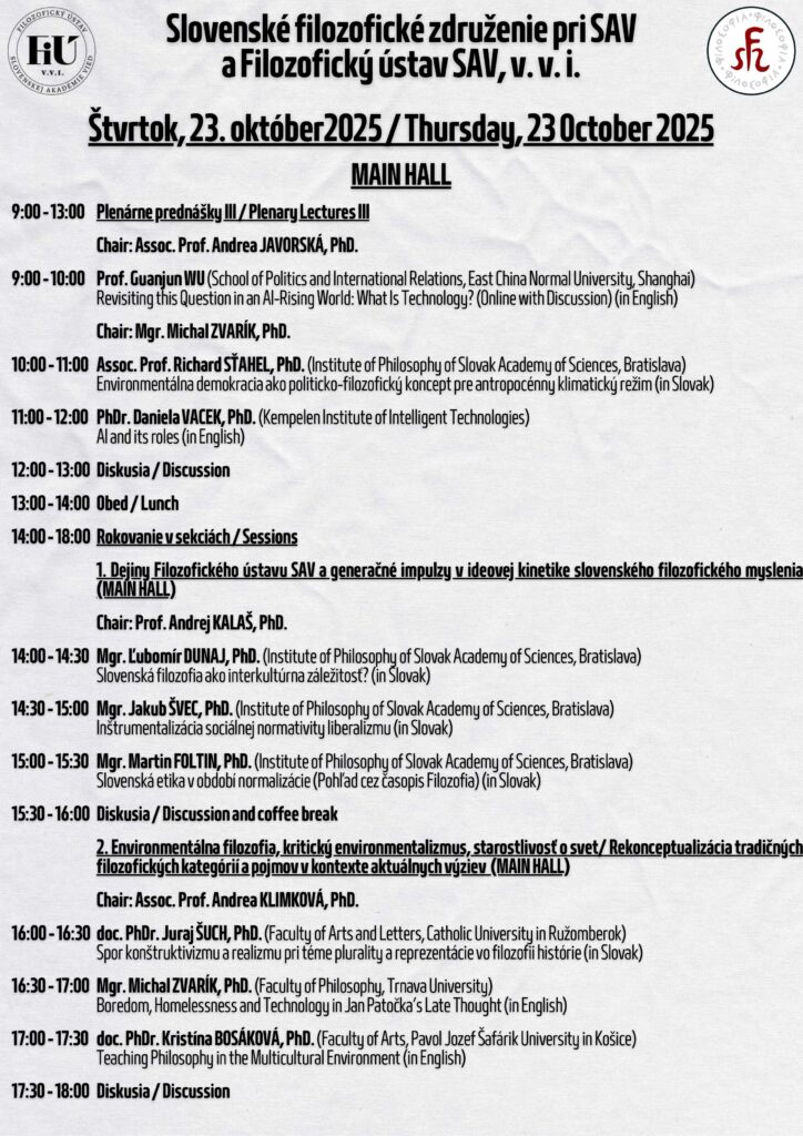 - Technológia a AI – čo je technológia v ére AI (Guanjun Wu); roly AI (Vacek); AI a nevedomie (Hvorecký); zodpovednosť, duševné vlastníctvo, vzťahy človek–AI (workshop).