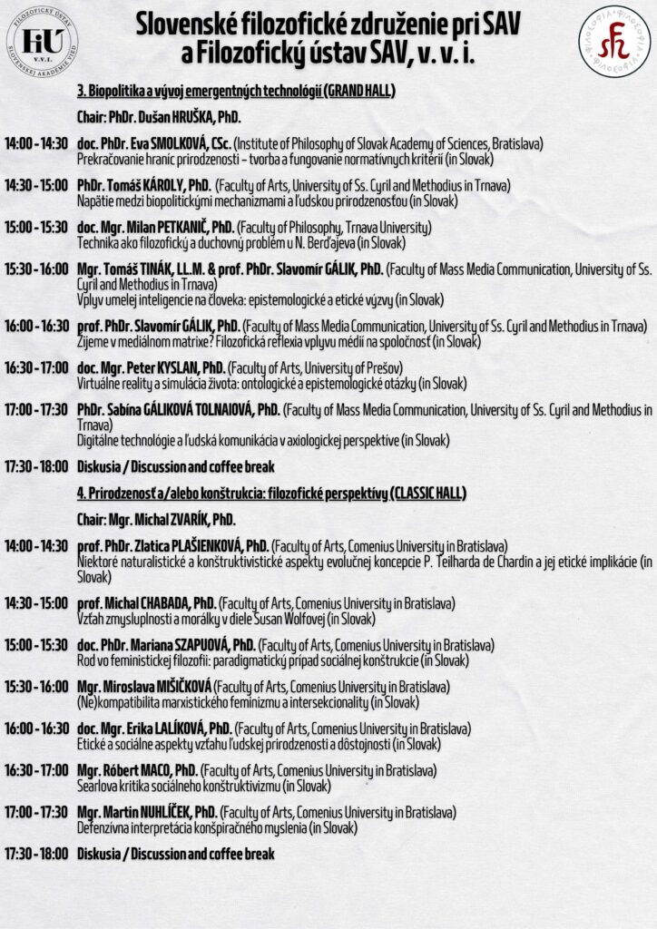 - Biopolitika a ľudská prirodzenosť (biotechnológie; napätie mechanizmov a prirodzenosti; médiá a spoločnosť; VR a simulácia života).