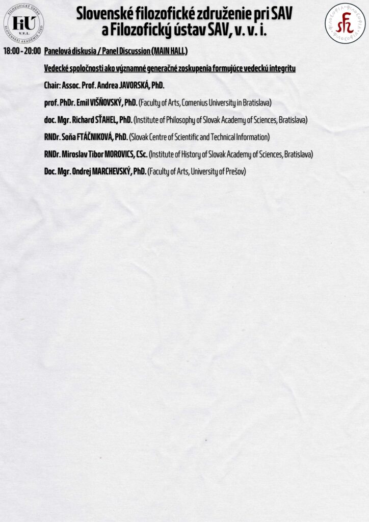 - Panelová diskusia (18:00 – 20:00): Vedecké spoločnosti ako významné generačné zoskupenia formujúce vedeckú integritu. Účastníci: Emil Višňovský, Richard Sťahel, Soňa Ftáčniková, Miroslav T. Morovics, Ondrej Marchevský.