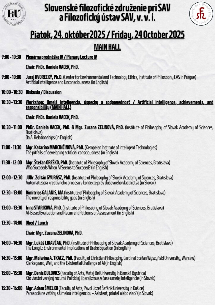- Workshop „Umelá inteligencia: úspechy a zodpovednosť“: blok k vzťahom s AI, umelej „vedomosti“ a právam duševného vlastníctva, vrátane tém zodpovednostných medzier a hodnotenia založeného na AI. Príspevky Daniely Vacek & Zuzany Zelinovej, Kataríny Marcinčinovej, Štefana Oreška, Zoltána Gyurásza, Dimitriosa Galanisa a Iriny Starikovej.