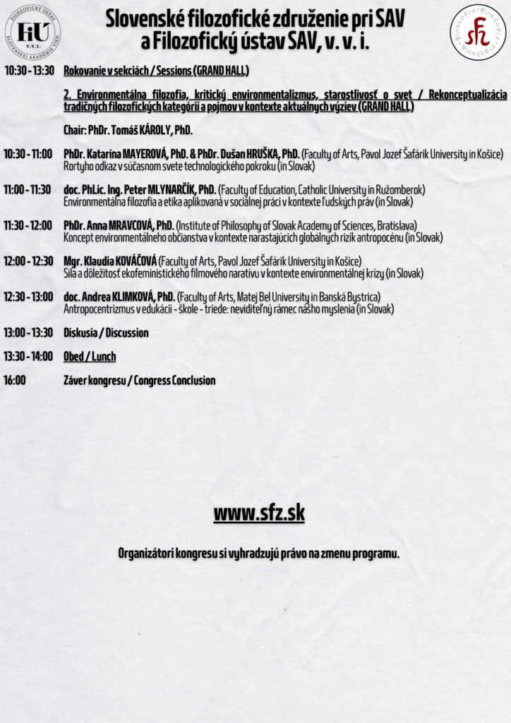 - Environmentálna filozofia a kritický environmentalizmus (Rorty v technologickom svete; environmentálne občianstvo; ekofeministický filmový naratív; antropocentrizmus v edukácii).