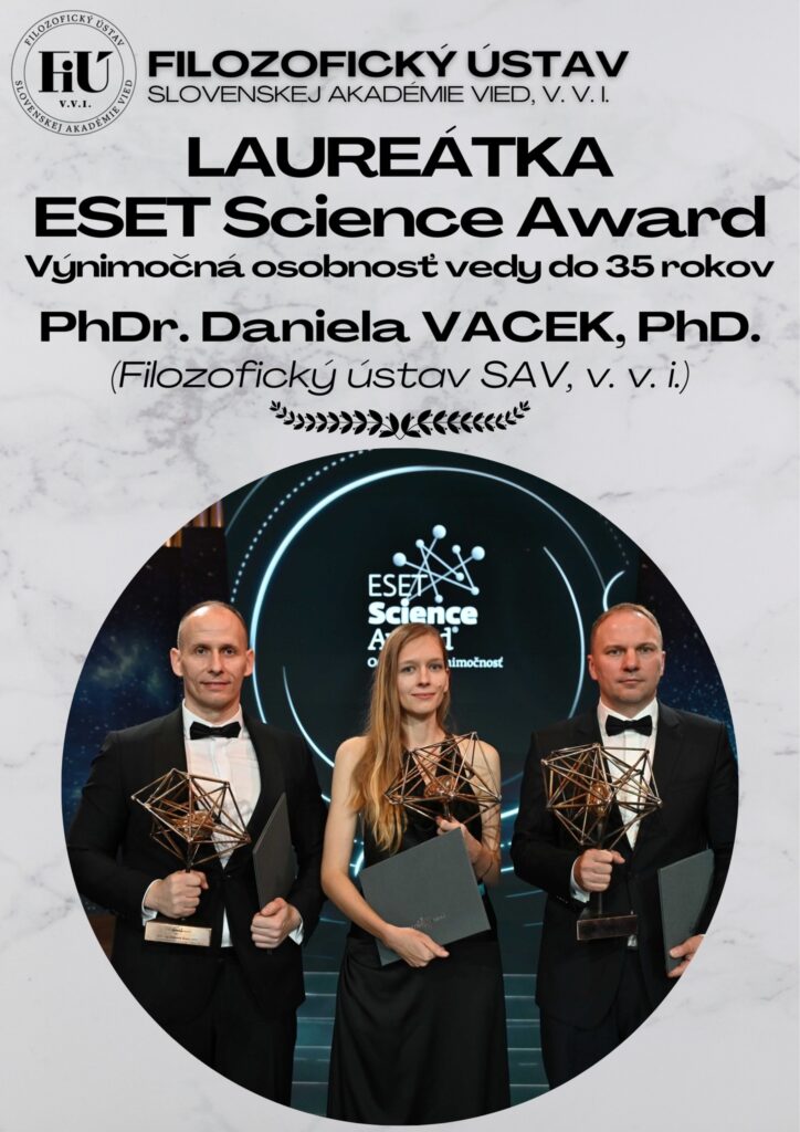 Naša vedecká pracovníčka Daniela Vacek (Filozofický ústav SAV, v. v. i.) zvíťazila v kategórii „Výnimočná osobnosť vedy do 35 rokov“ a získala prestížne ocenenie ESET Science Award.