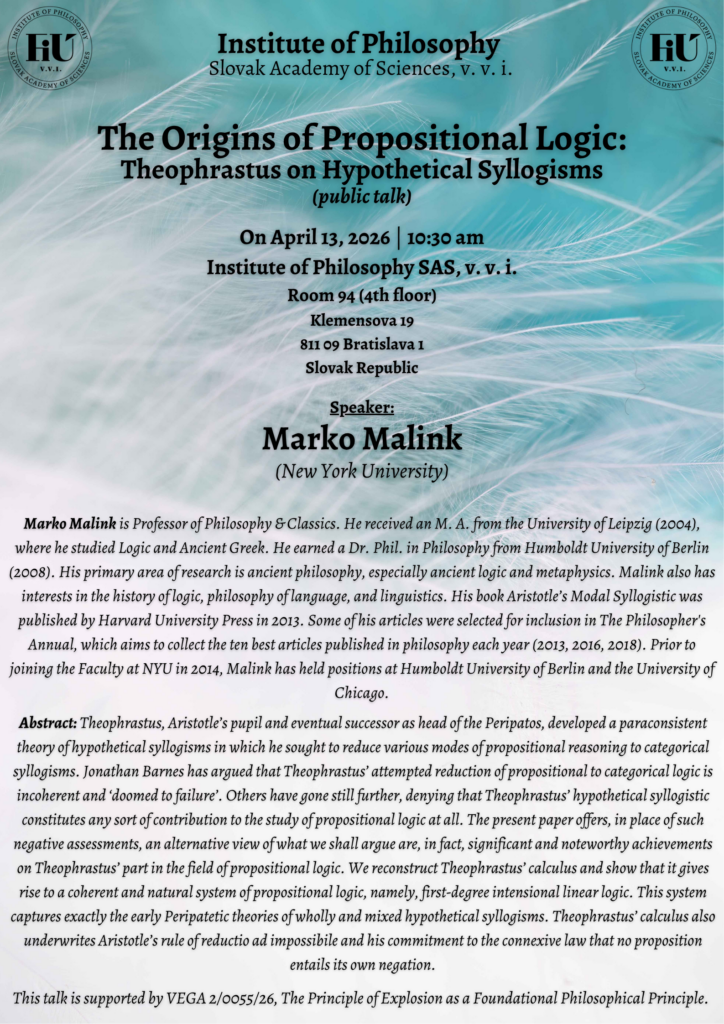 Abstrakt: Theofrastos, Aristotelov žiak a neskorší nástupca vo funkcii hlavy Peripatetickej školy, vyvinul parakonzistentnú teóriu hypotetických sylogizmov, v ktorej sa snažil zredukovať rôzne spôsoby výrokového uvažovania na kategorické sylogizmy. Jonathan Barnes tvrdí, že Theofrastov pokus o redukciu výrokovej logiky na kategorickú logiku je nekoherentný a „odsúdený na neúspech“. Iní zašli ešte ďalej a popierajú, že by hypotetická sylogistika Theofrasta predstavovala akýkoľvek príspevok k štúdiu výrokovej logiky. Tento článok ponúka namiesto takýchto negatívnych hodnotení alternatívny pohľad na to, čo budeme považovať za významné a pozoruhodné úspechy Theofrasta v oblasti výrokovej logiky. Rekonštruujeme Theofrastov kalkul a ukazujeme, že vedie ku koherentnému a prirodzenému systému výrokovej logiky, konkrétne intencionálnej lineárnej logike prvého stupňa. Tento systém presne zachytáva rané peripatetické teórie úplných a zmiešaných hypotetických sylogizmov. Theofrastov kalkul tiež podporuje Aristotelovo pravidlo reductio ad impossibile a jeho záväzok ku konektívnemu zákonu, že žiadna propozícia nevyžaduje vlastnú negáciu.