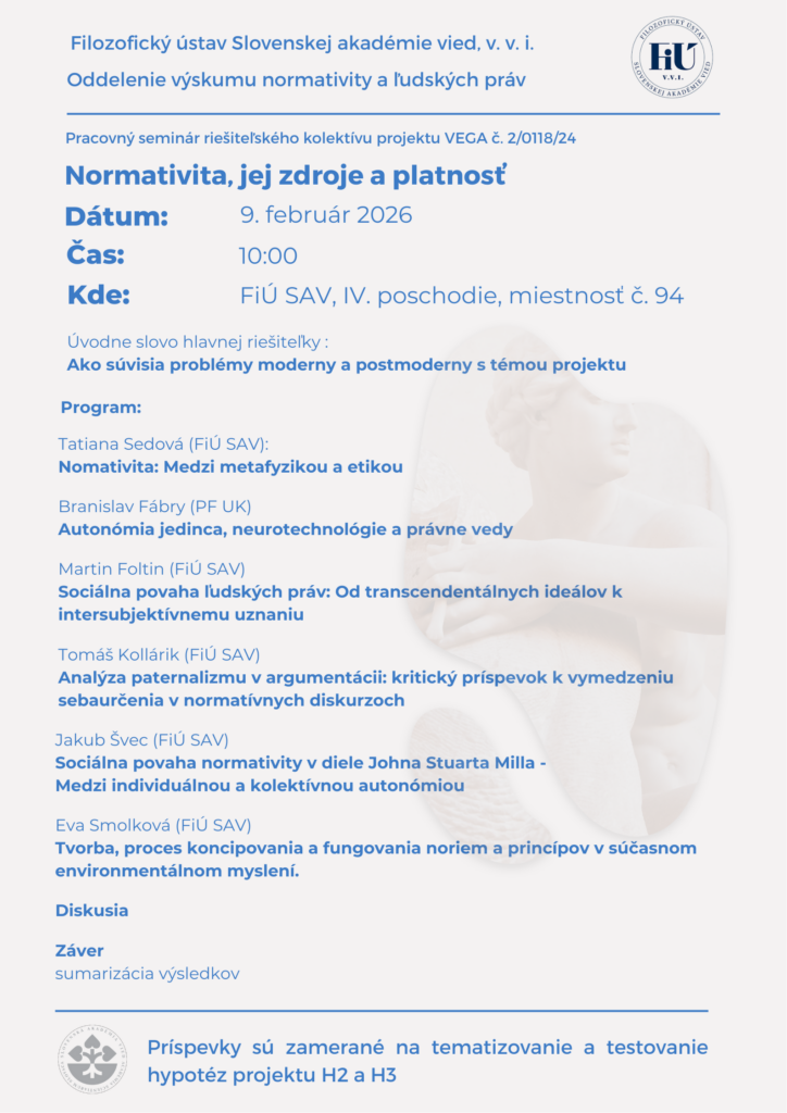 Filozofický ústav SAV pozýva na seminár s názvom „Normativita, jej zdroje a platnosť„, ktorý sa uskutoční 9. 2. 2026 o 10:00 v zasadacej miestnosti č. 94. na 4. poschodí, v priestoroch ústavu (Klemensova 19, Bratislava).